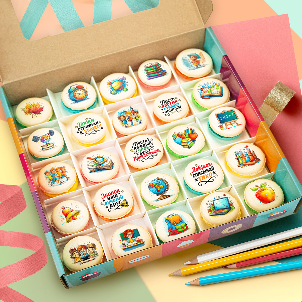 Закажите этот набор, если хотите по-настоящему удивить! 25 макарун с уникальными школьными принтами, упакованные в большую коробку с окошком, — это самый впечатляющий сладкий презент. Мы пополнили в коллекцию новыми принтами.