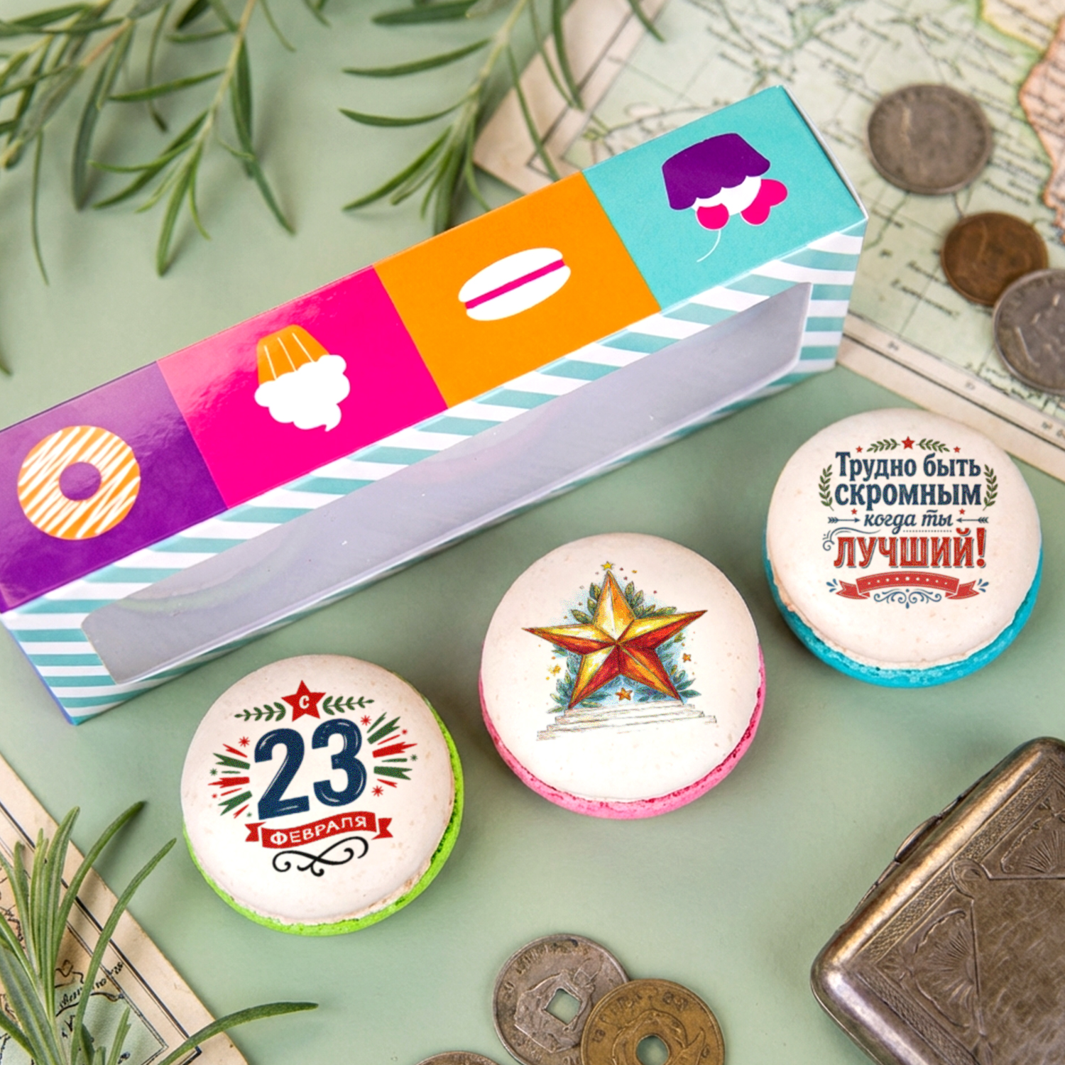 Все описаниеСладкий комплимент на 23 февраля для друзей и коллег - набор пирожных-макаронс со съедобными принтами. Можно подарить отдельно или дополнить основной презент.