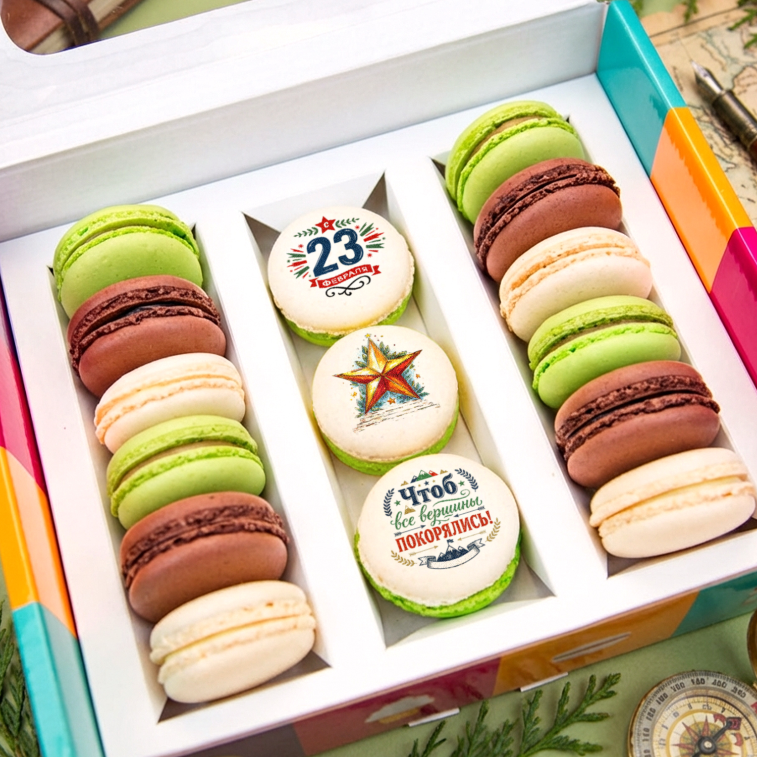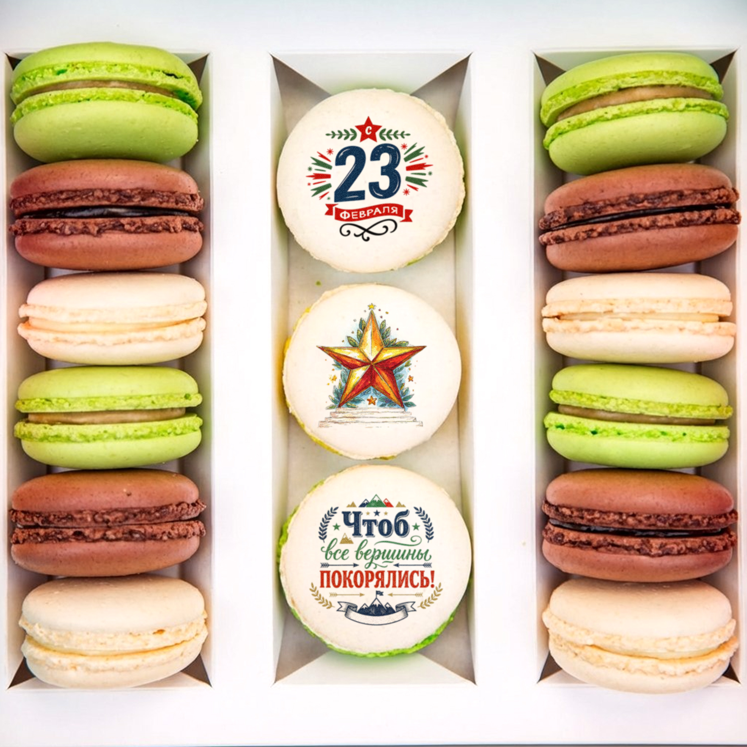 Набор макаруни из 15 штук к Дню Защитника Отечества - приятные любому мужчине поздравления, яркие цвета и аппетитные начинки. В цветной подарочной коробке 3 ванильных макаруни с принтом, 4 карамельных, 4 шоколадных и 4 ванильных макаруни. Размер коробки - 24 х 21 х 6 см.