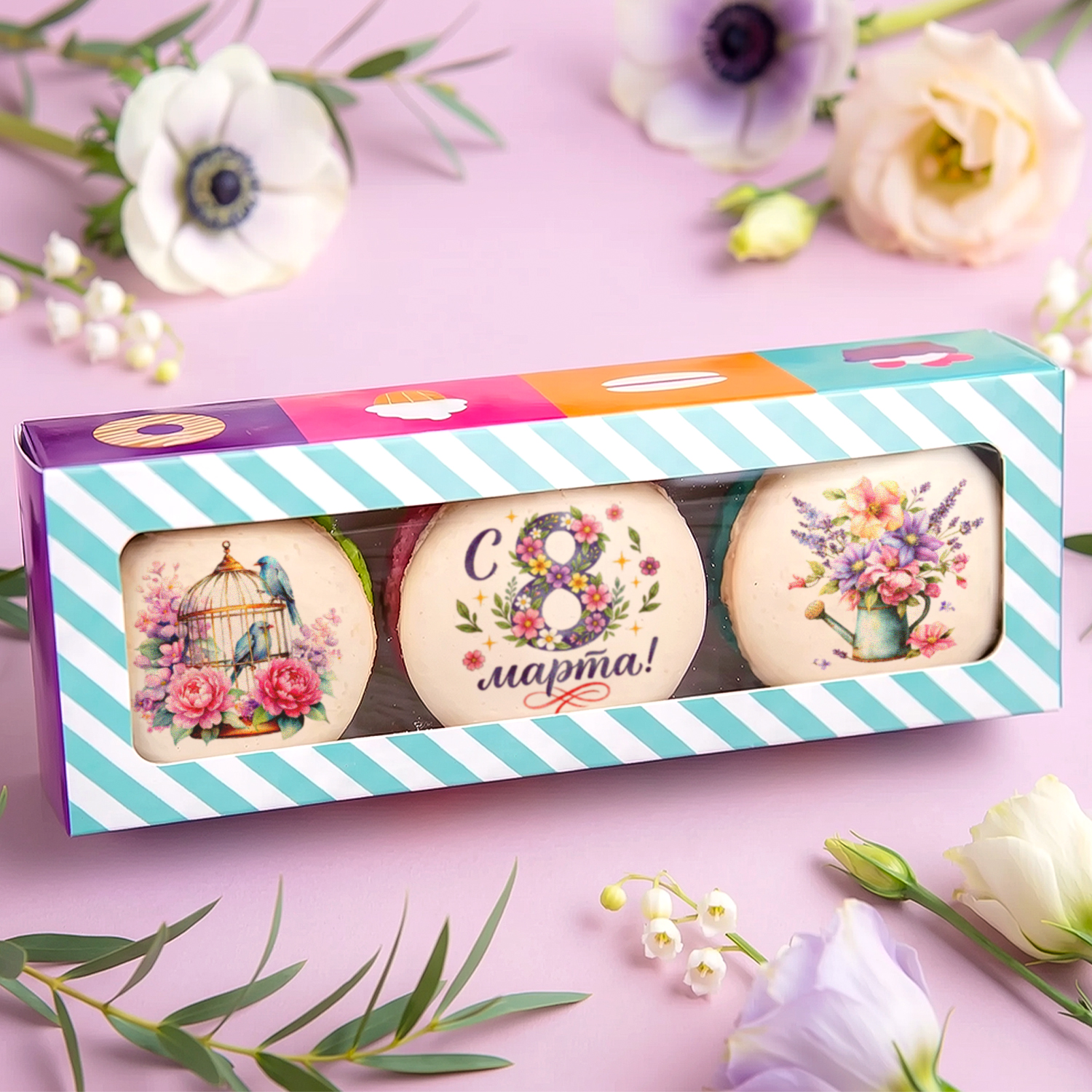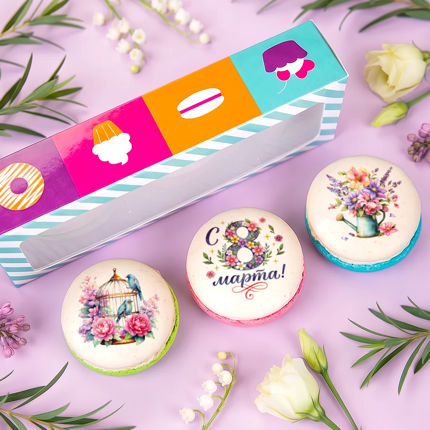 - Сахарная пудра, миндальная мука, белок, фруктовая/кремовая начинка
