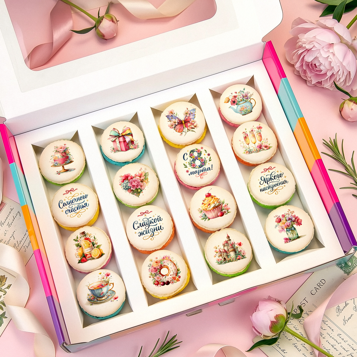 Все описаниеНабор миндальных пирожных с нежными начинками-ассорти. Съедобные принты нанесены пищевыми красками. Удивите близких ярким и сладким подарком на 8 марта!