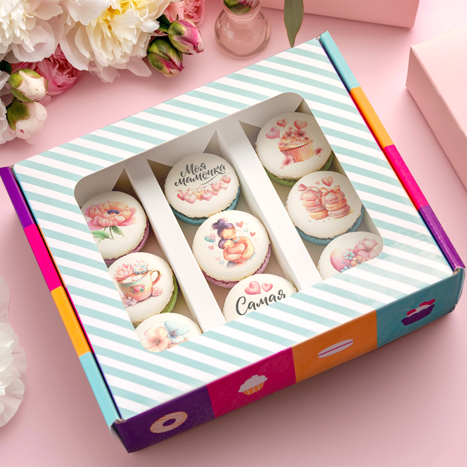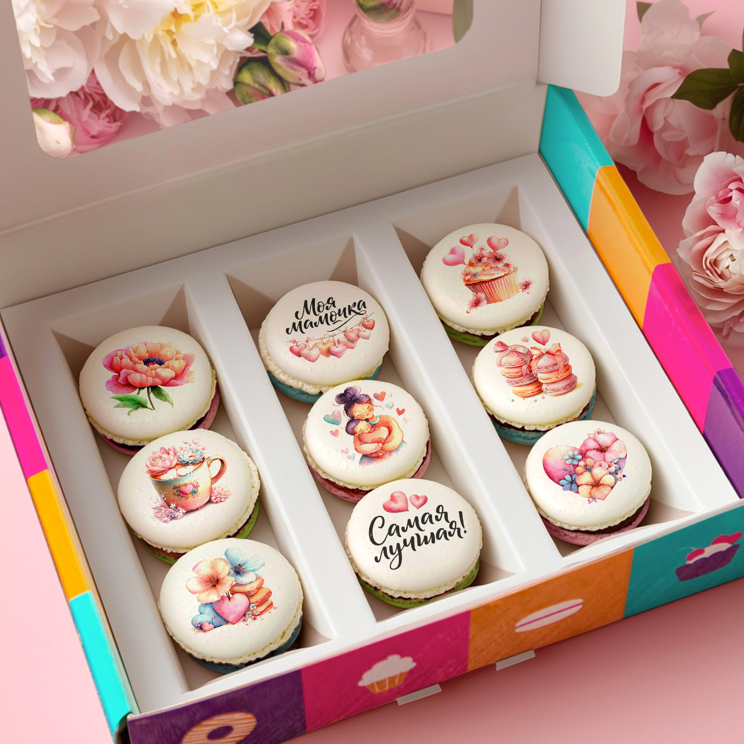 В наборе 9 макарун по 3 шт со вкусами: малина, кокос, карамель. Порадуйте свою маму нежной сладостью набора макарун.