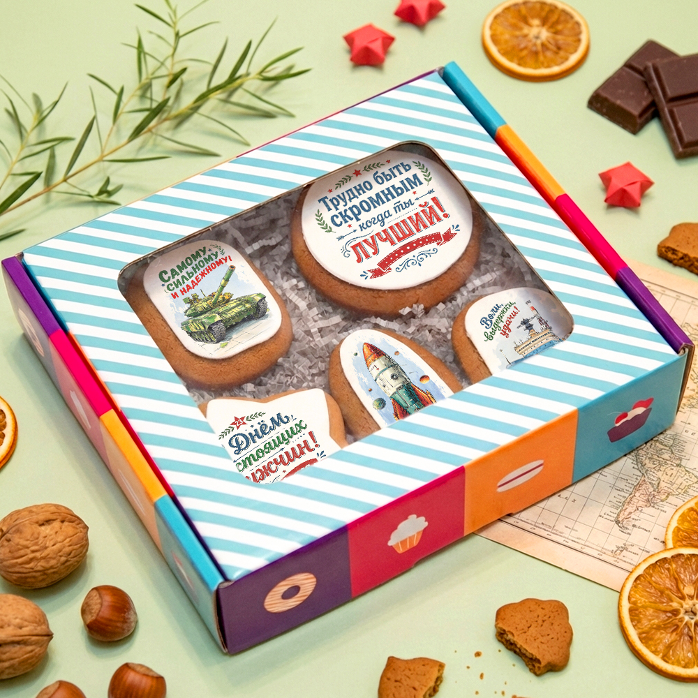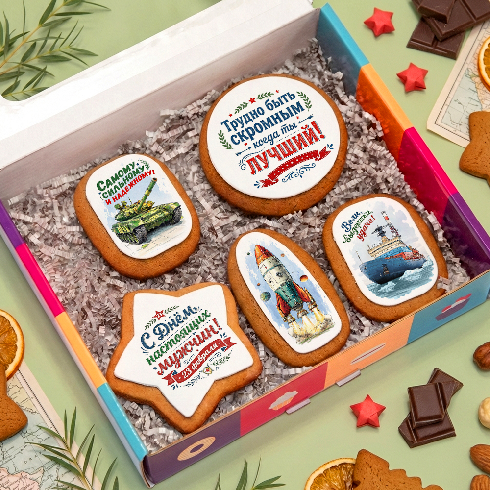 Вкусный подарочный набор имбирных пряников на 23 февраля - креативный подарок для мужчин любого возраста. Тематические принты, яркий имбирно-медовый вкус не оставят никого равнодушным! В коробочке находятся 5 пряников с картинками на военную тематику. Быстрая и удобная доставка в выбранный вами день. *Вы можете заказать печать логотипа на любом печенье или прянике, любую форму печенья..