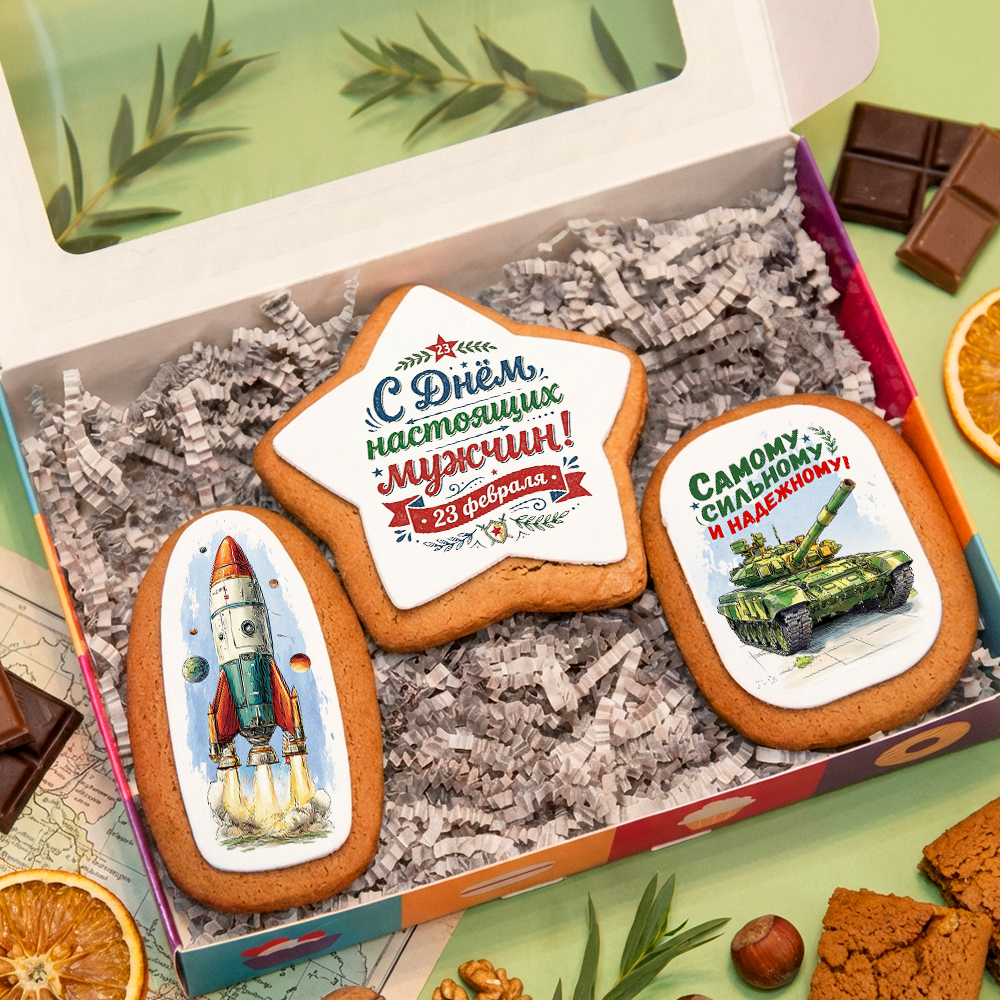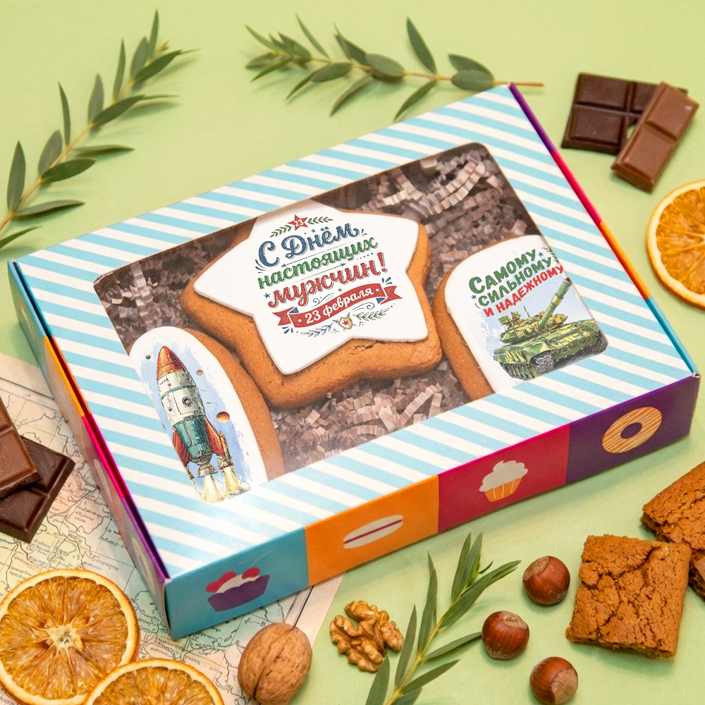 Красочный подарочный набор имбирного печенья на 23 февраля - медовые пряники со съедобными картинками, нанесенными на мастику. Размер одного пряника - 5-8 см.
