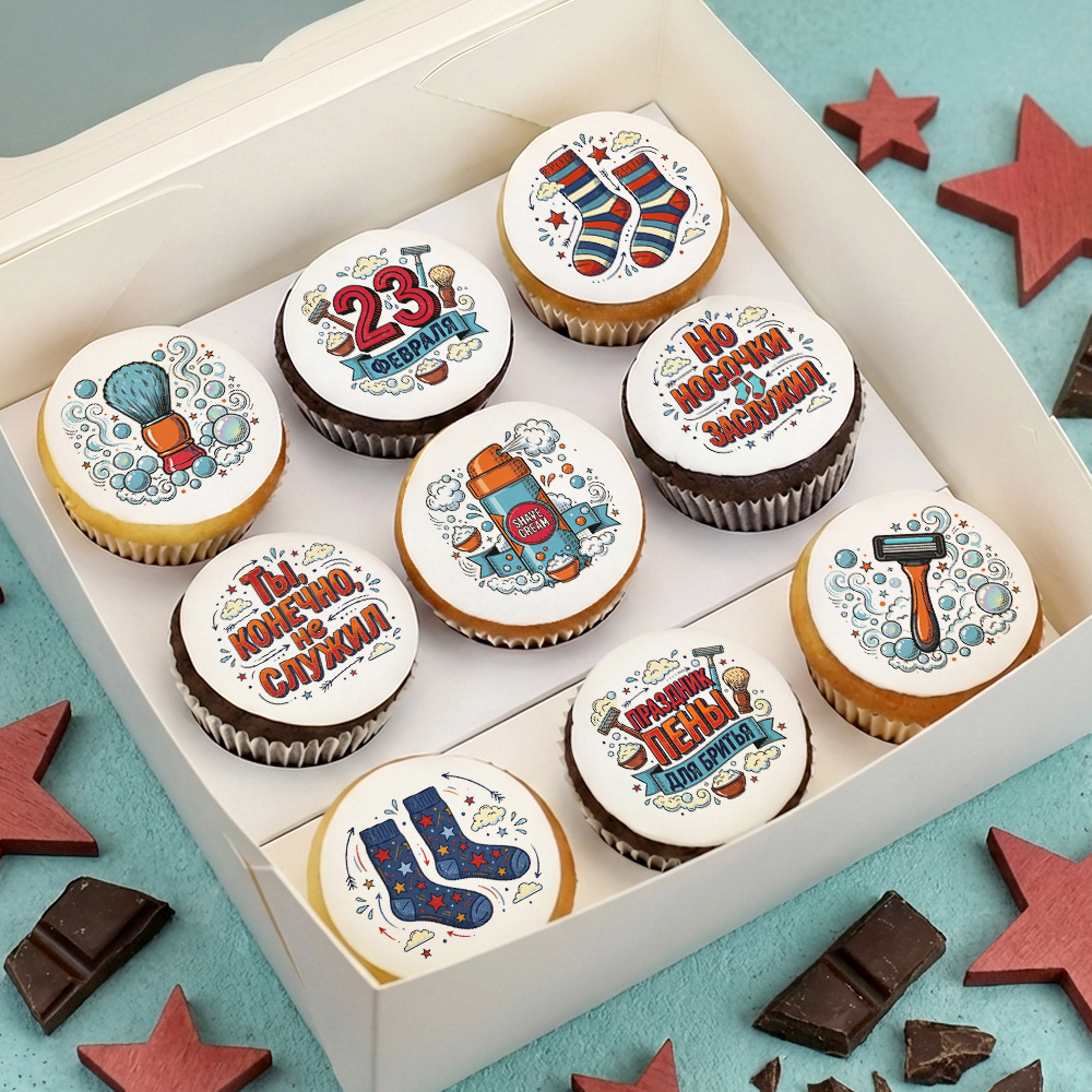 Все описаниеНабор ванильных и шоколадных бисквитных пирожных с нежным кремом внутри - удивите ваших друзей и любимых сладким подарком! Веселые съедобные принты на сахарной мастике точно поднимут им настроение.
