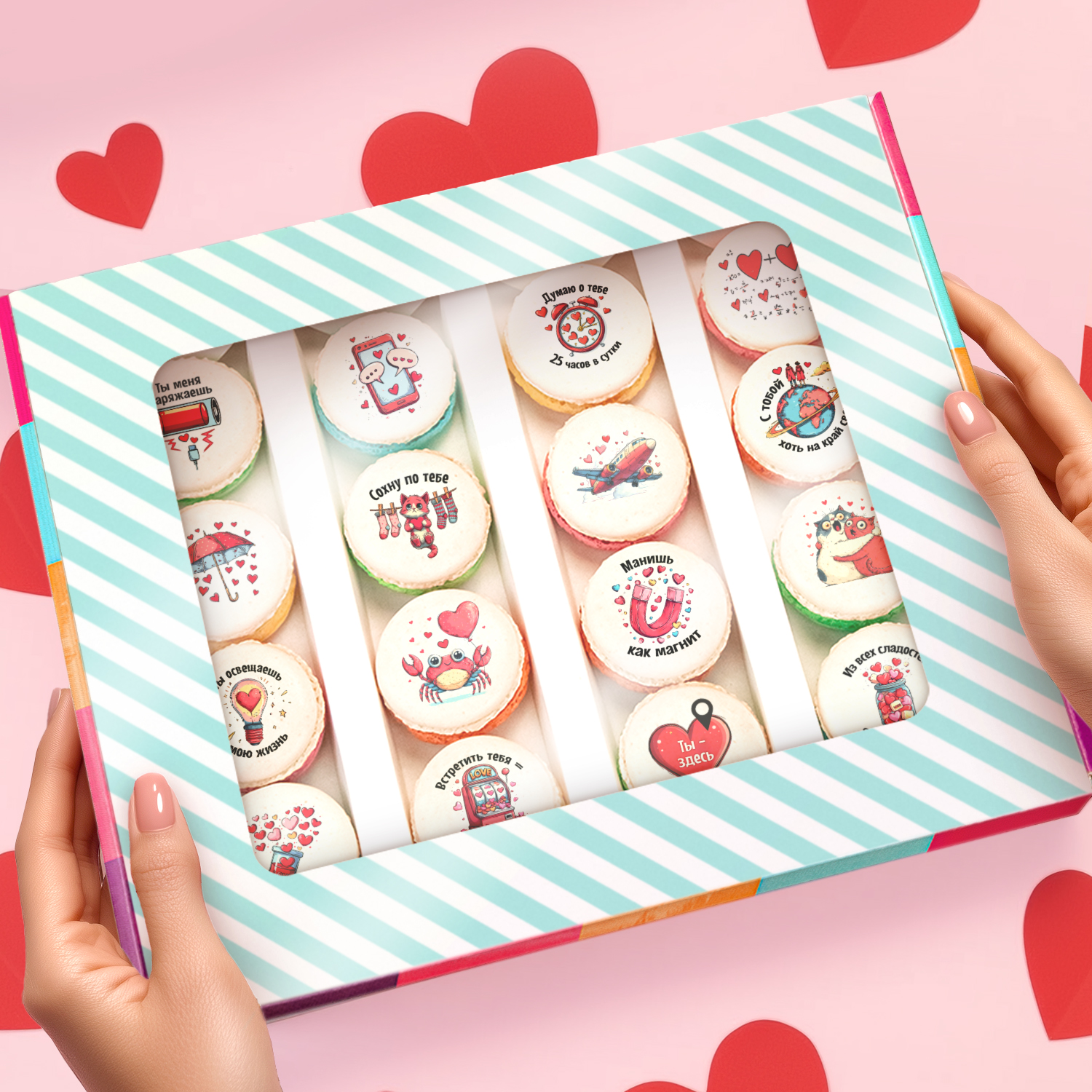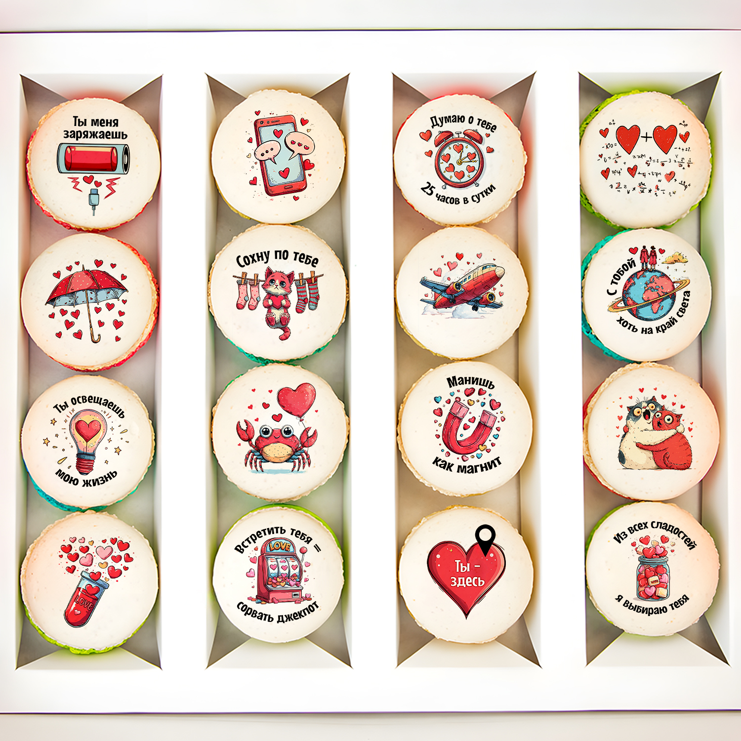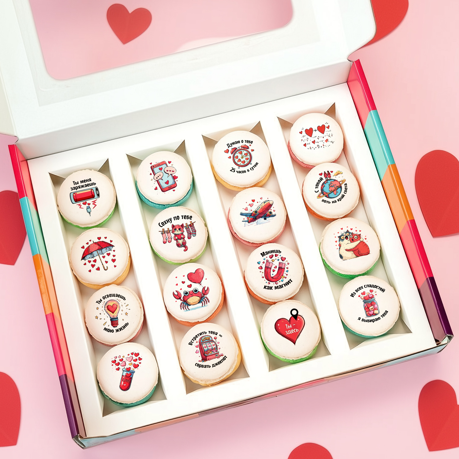Все описаниеНабор пирожных макарони с надписью "С 14 февраля". На пирожные нанесено съедобное изображение. Состав: 16 макаронс ассорти