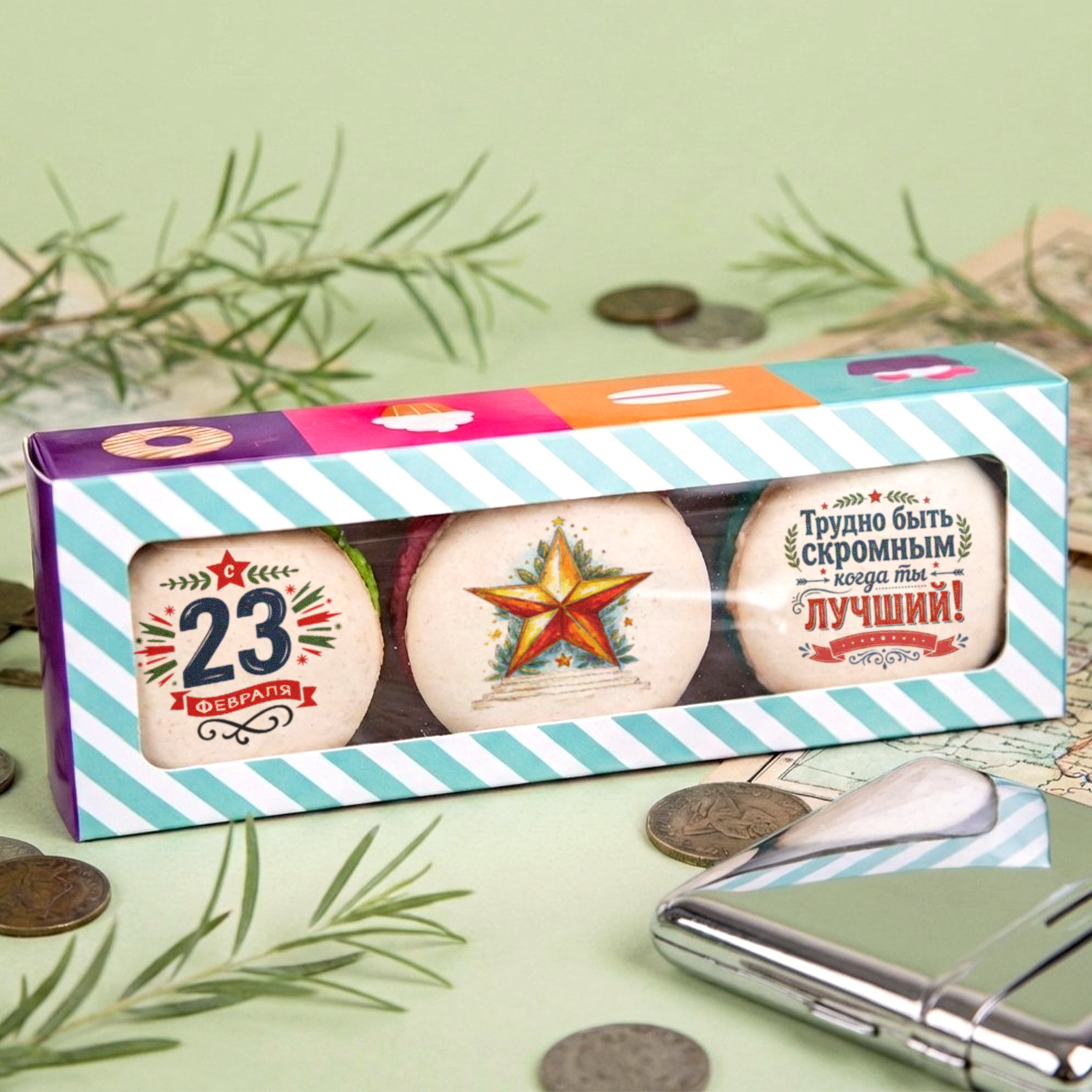 Все описаниеСладкий комплимент на 23 февраля для друзей и коллег - набор пирожных-макаронс со съедобными принтами. Можно подарить отдельно или дополнить основной презент.