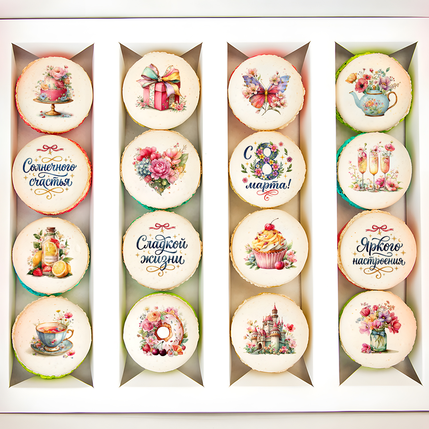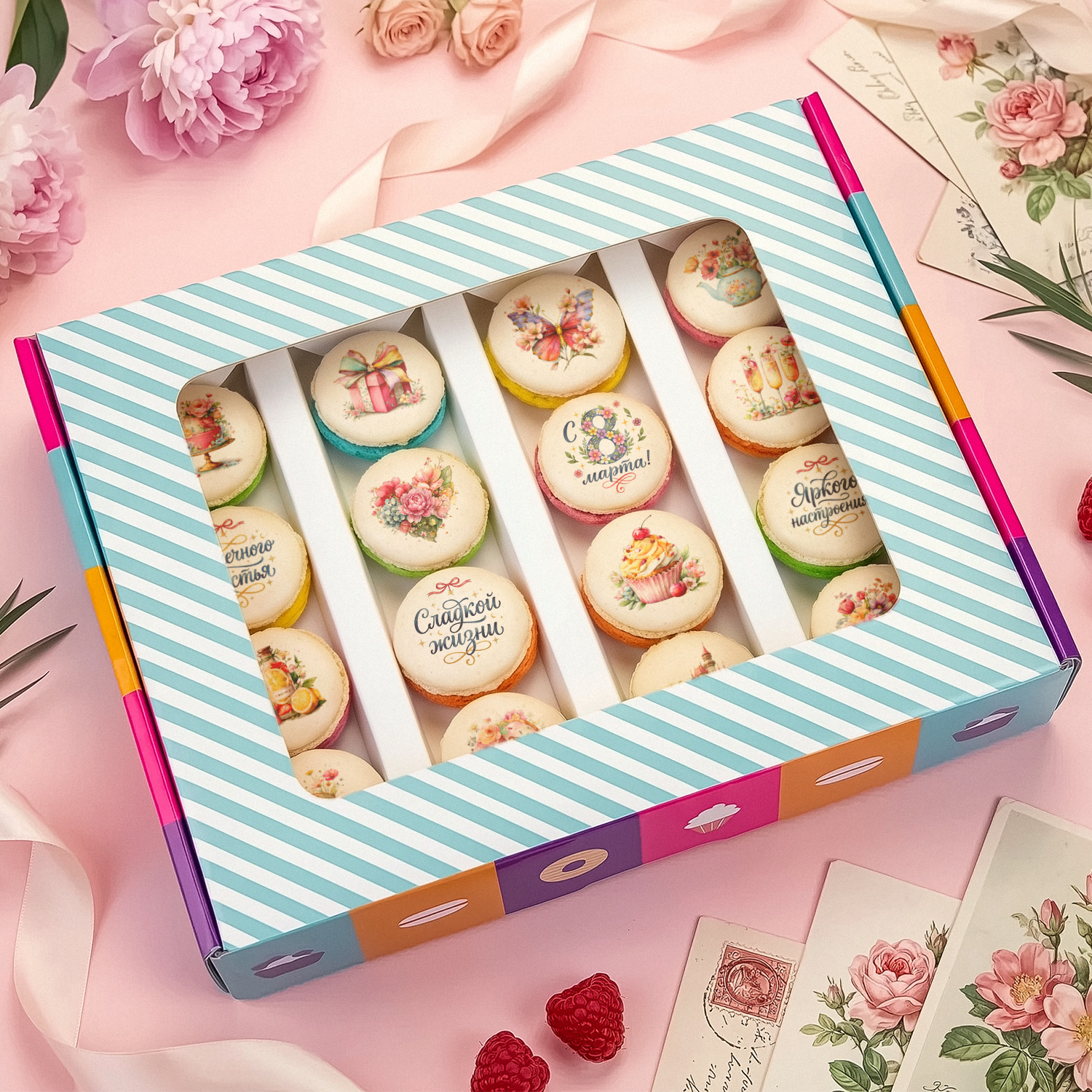 Все описаниеНабор миндальных пирожных с нежными начинками-ассорти. Съедобные принты нанесены пищевыми красками. Удивите близких ярким и сладким подарком на 8 марта!