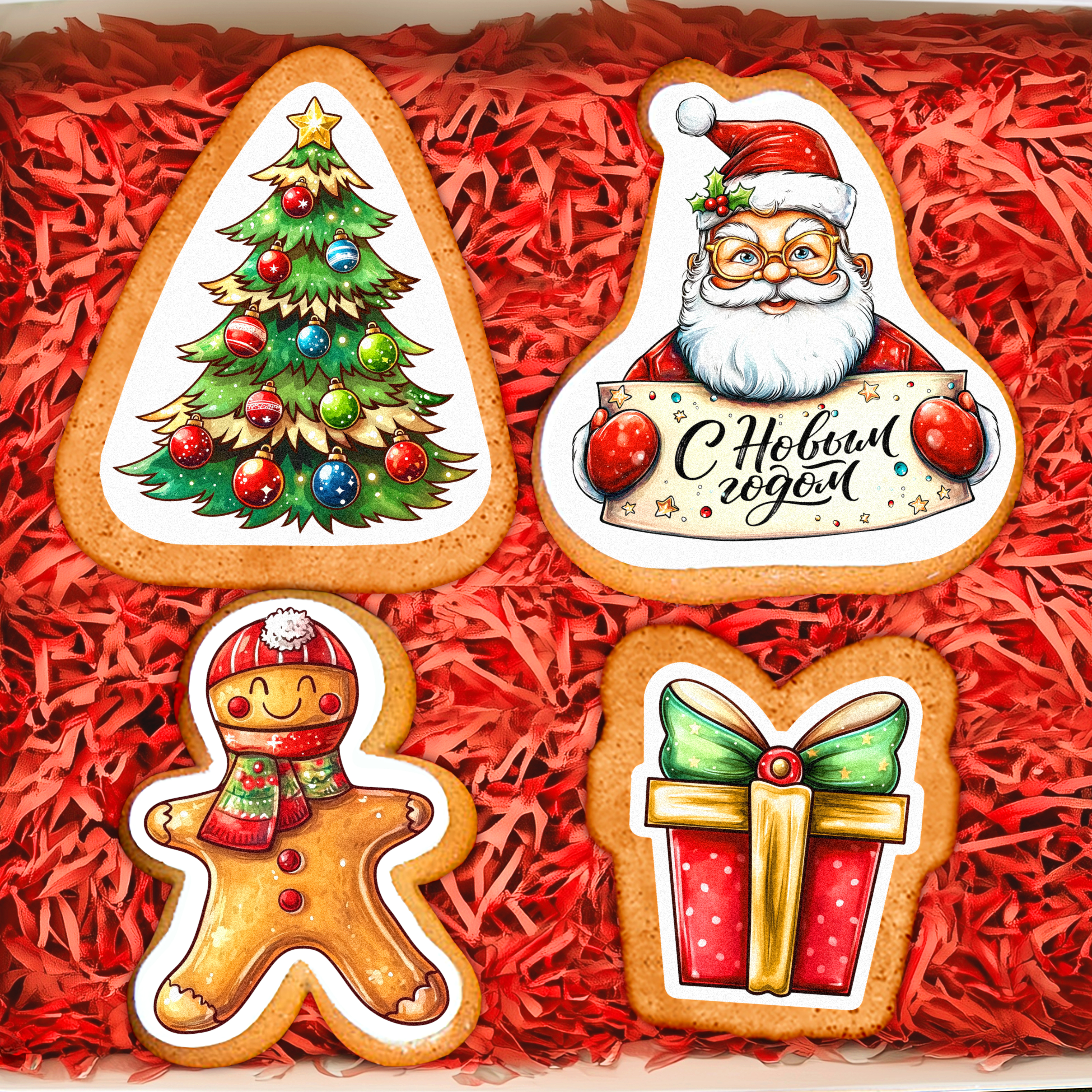 В наборе 4 фигурных имбирных пряника - Дед Мороз, варежка, новогодняя свеча и леденец-трость.