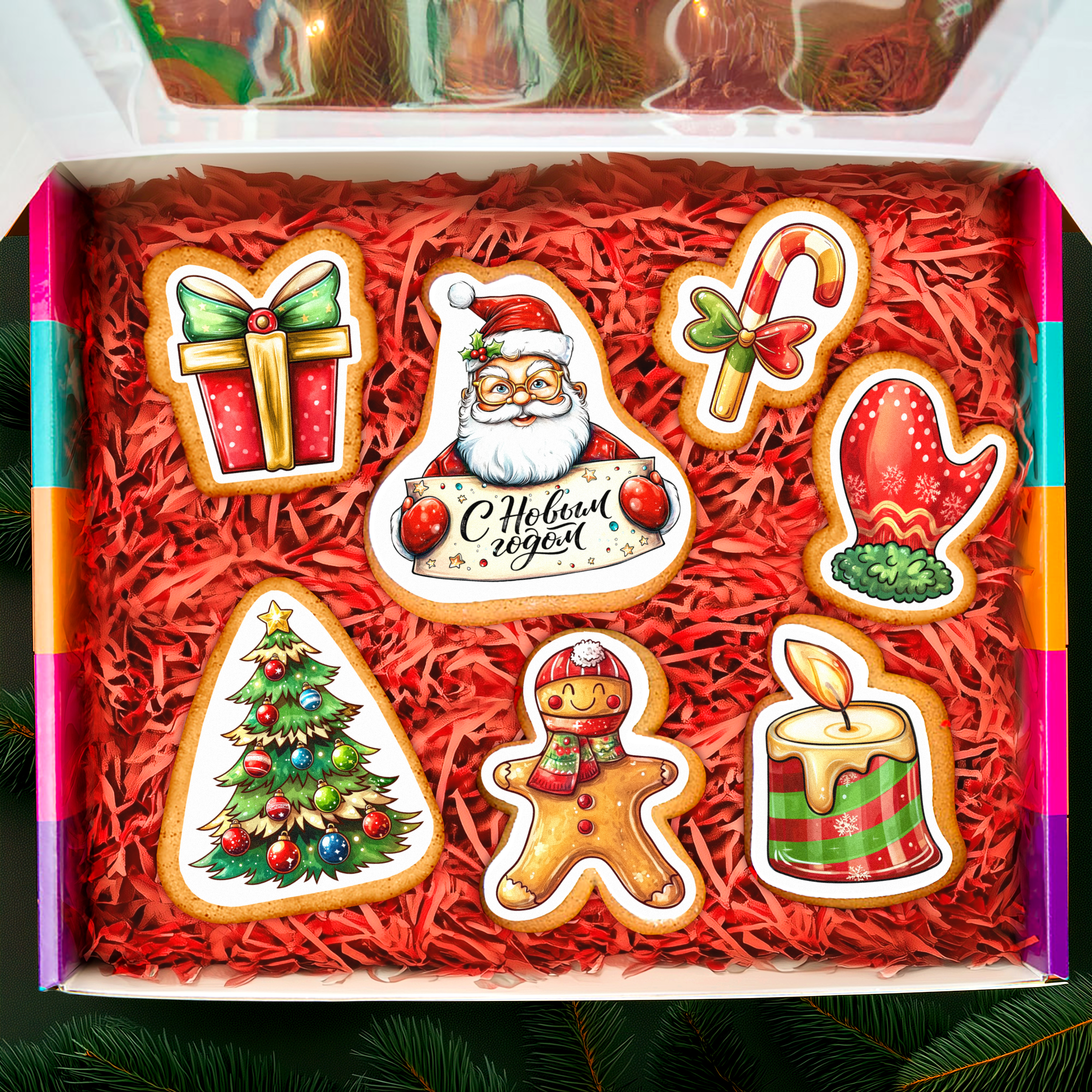 В наборе 7 небольших печений - звездочка, леденец-трость, пряничный человечек, елка, Санта-Клаус, свеча и варежка.