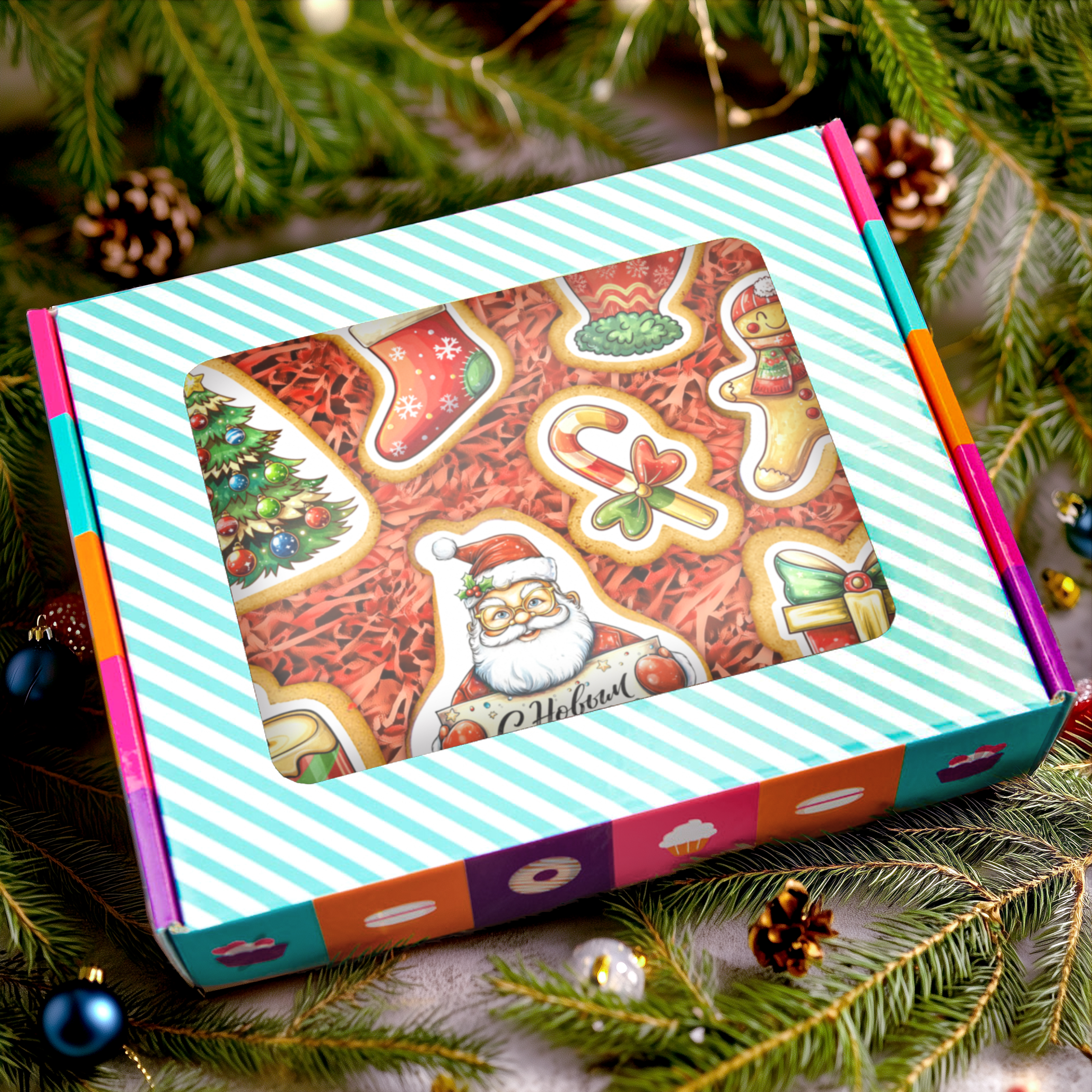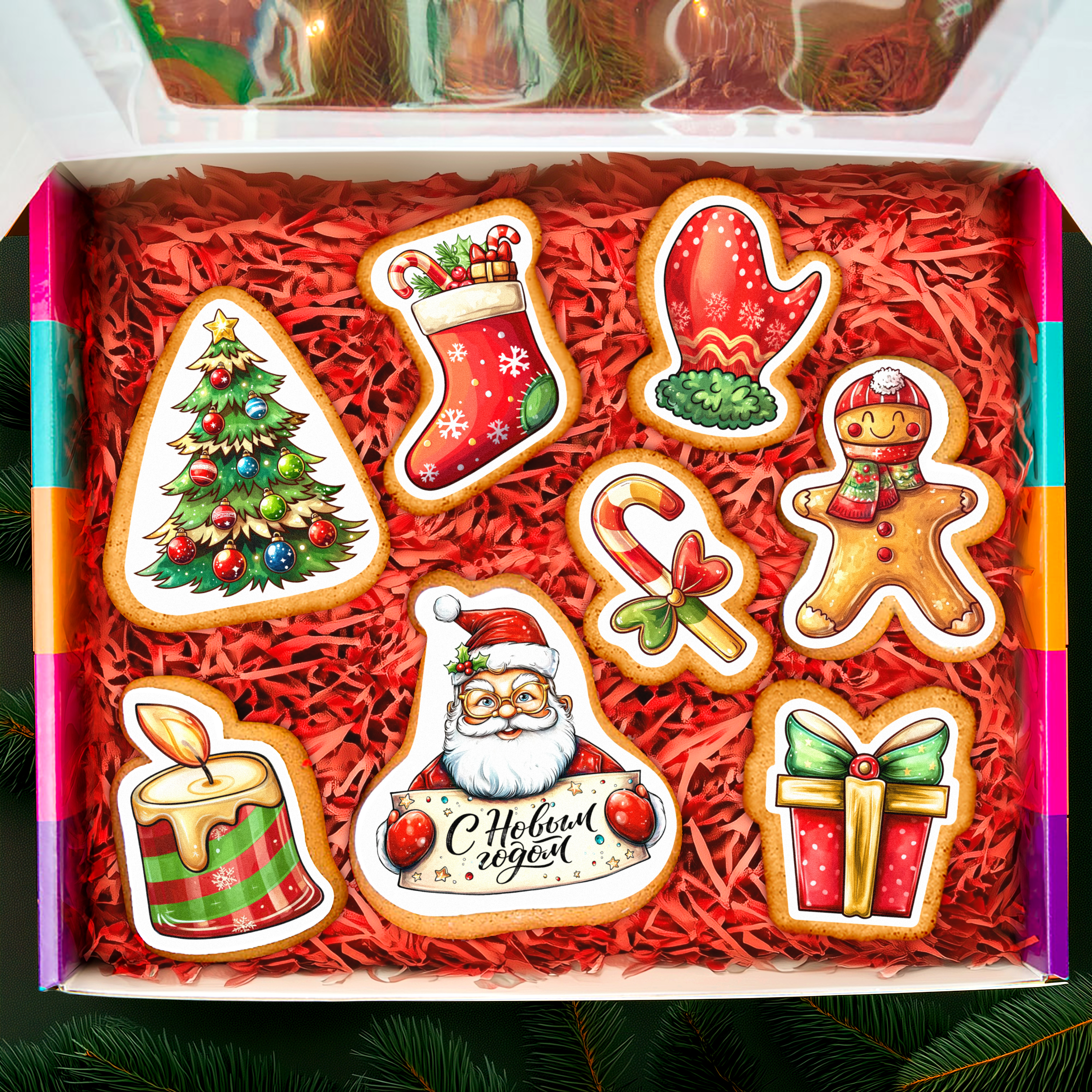В наборе 8 небольших печений - звездочка, леденец-трость, пряничный человечек, елка, Санта-Клаус, свеча, рождественский сапожок и варежка.
