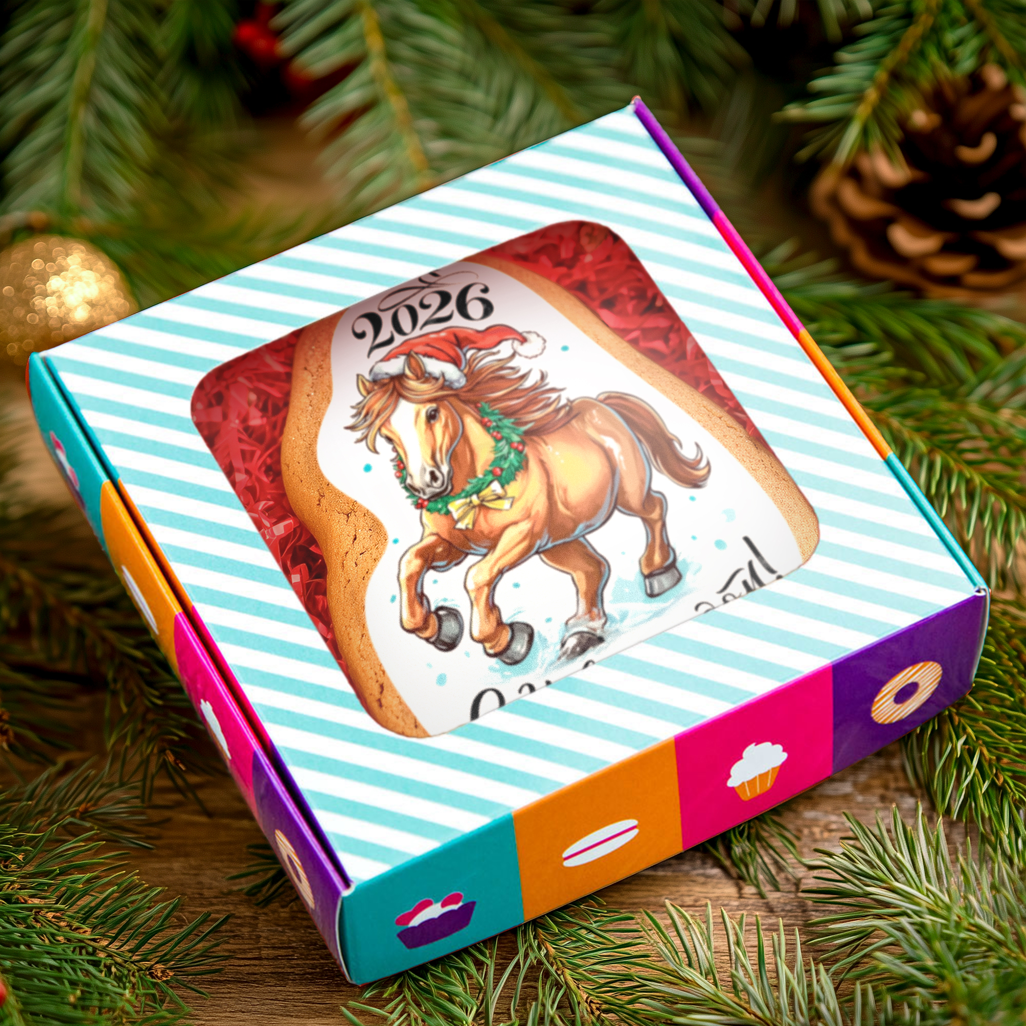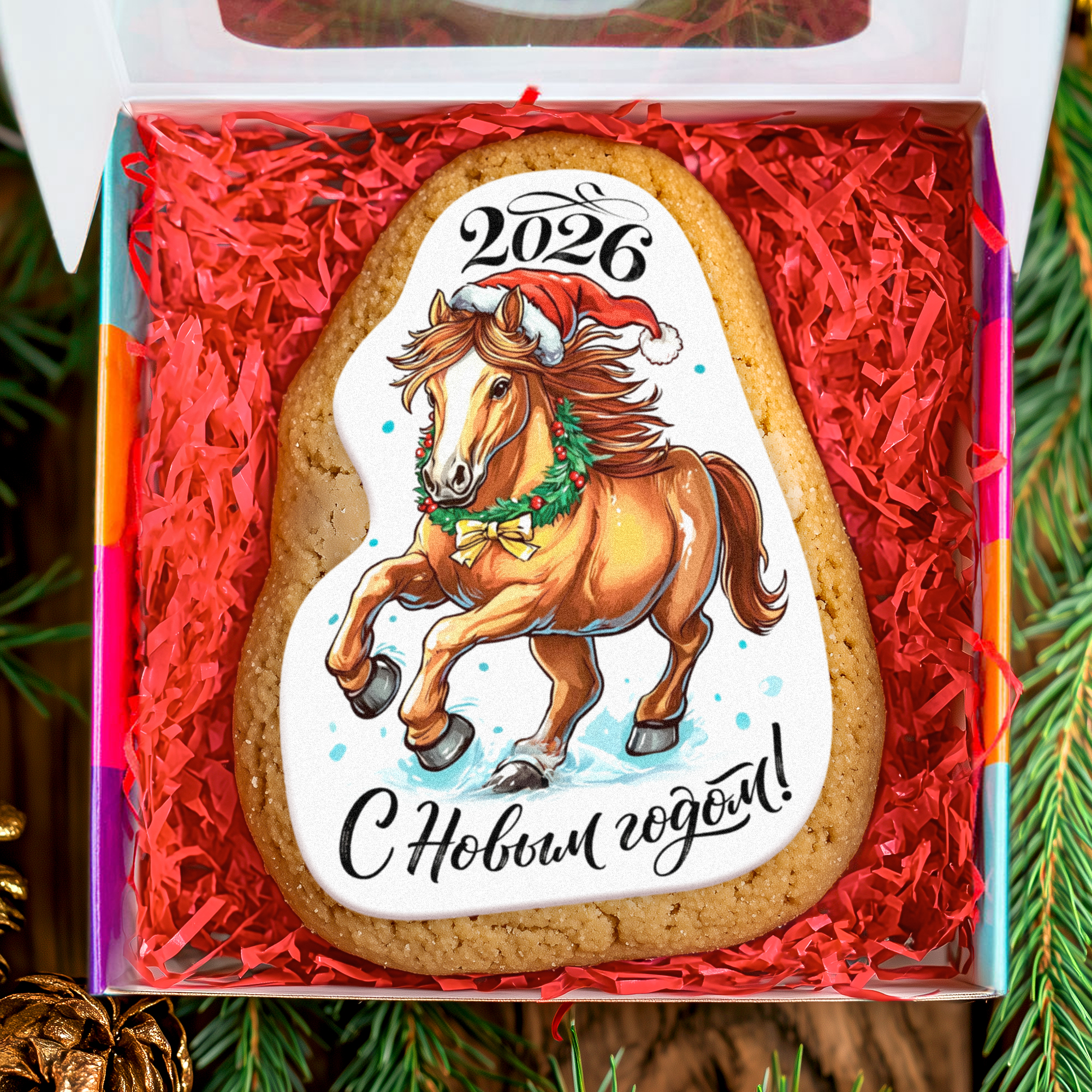 Имбирный пряник с ярким новогодним принтом - символ 2025 года. Пряник упакован в подарочную коробку. Доставка по Москве.